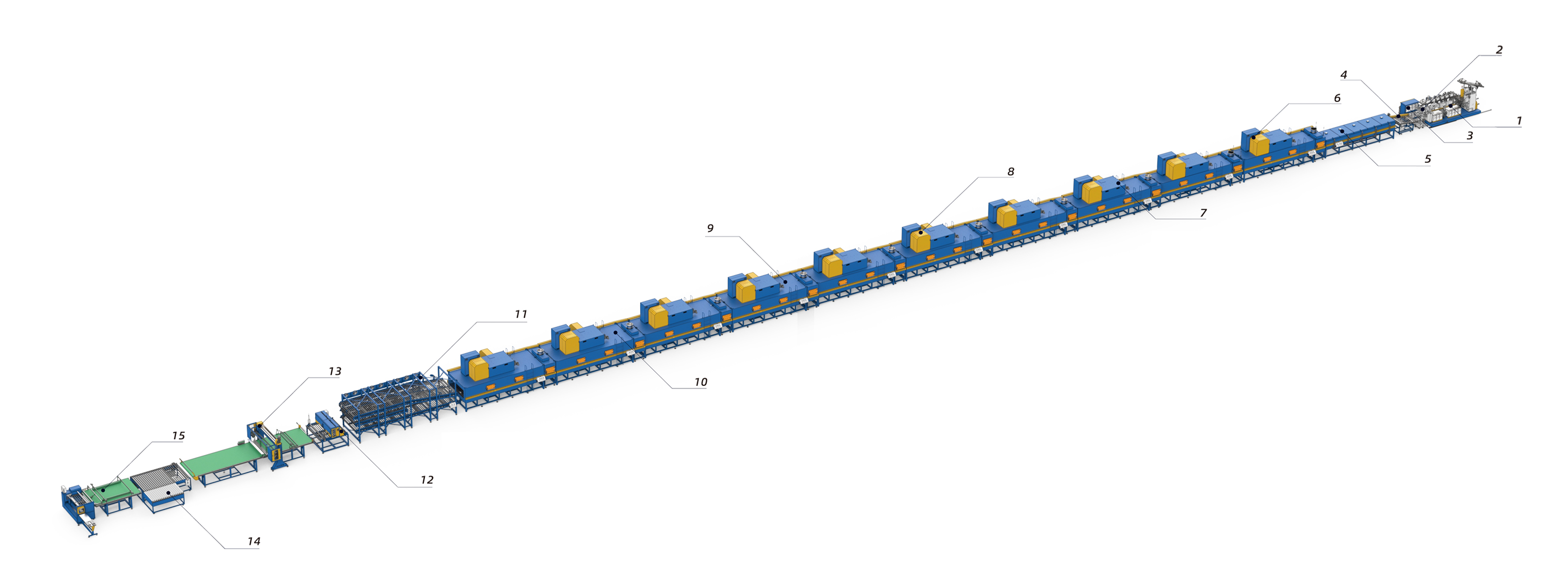 | 1-0150mm Exhaust cold feed extruder | 5-Infrared ovens | 9-6m Hot air curing oven(width 1800mm) x2 | 13-Cutting machine (saw blade) |