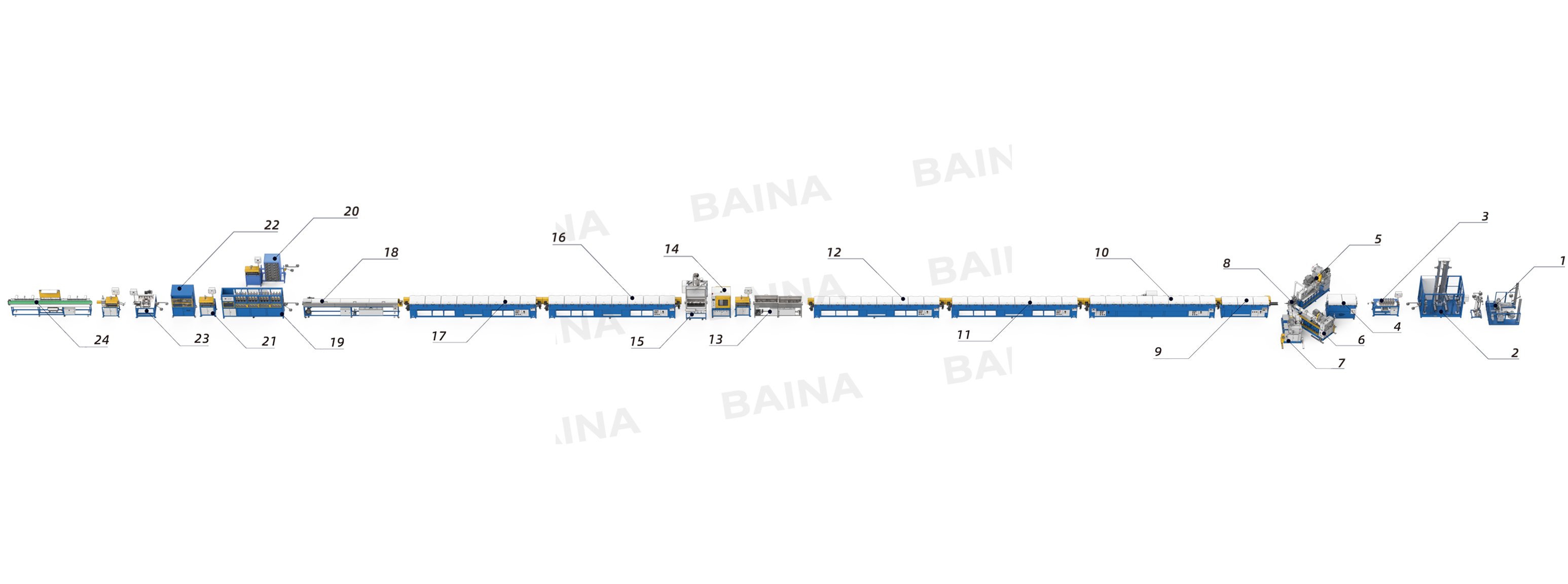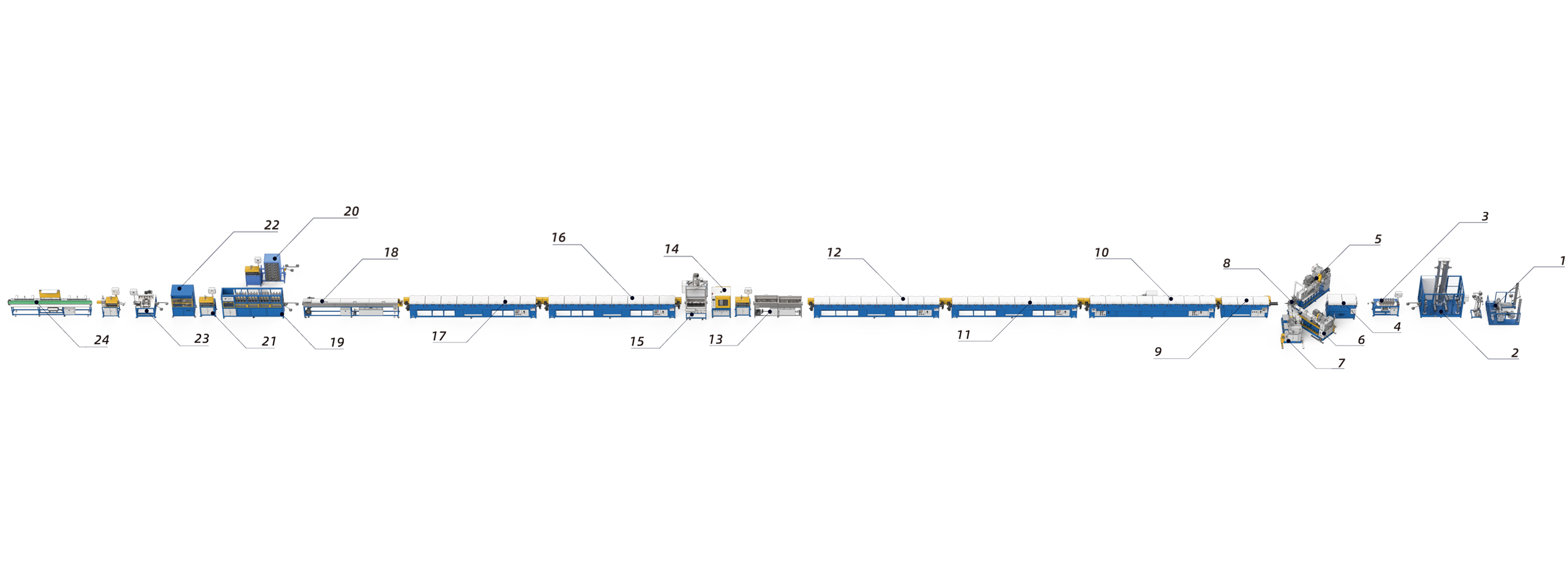 | 2-Accumulator(65m) | 6-090mm20D Cold feed vacuum rubber extruder | 10-8m Microwave vulcanization oven | 14-Plasma treatment | 18-6m Water cooling tank | 22-Drilling machine |