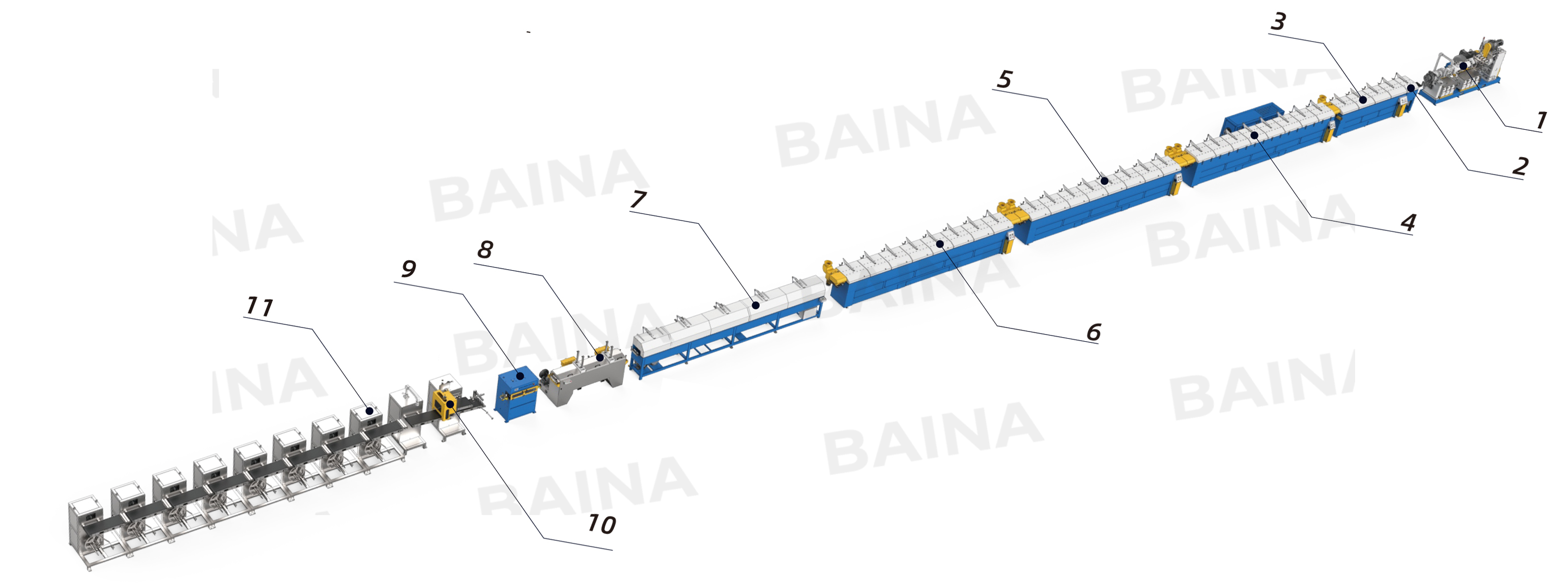 | 1-g150mm20D Cold Feed Vacuum Rubber Extruder | 4-8.9m 10KW Microwave curing oven (UHF) | 7-8m Cooling water tank | 10-Cutting machine |